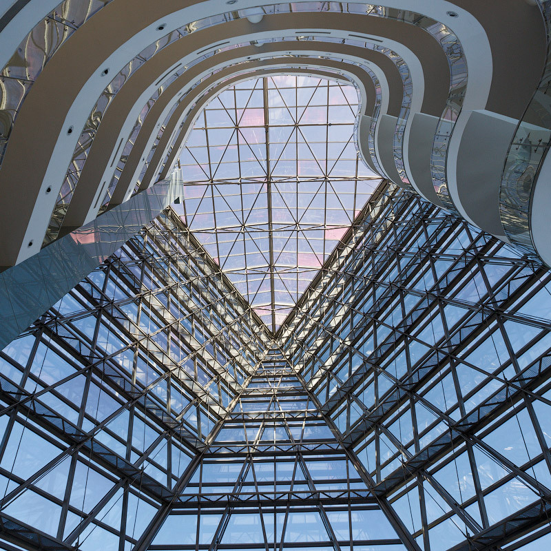 Стальная витражная система высотой 18 метров индивидуальной разработки и изготовления.